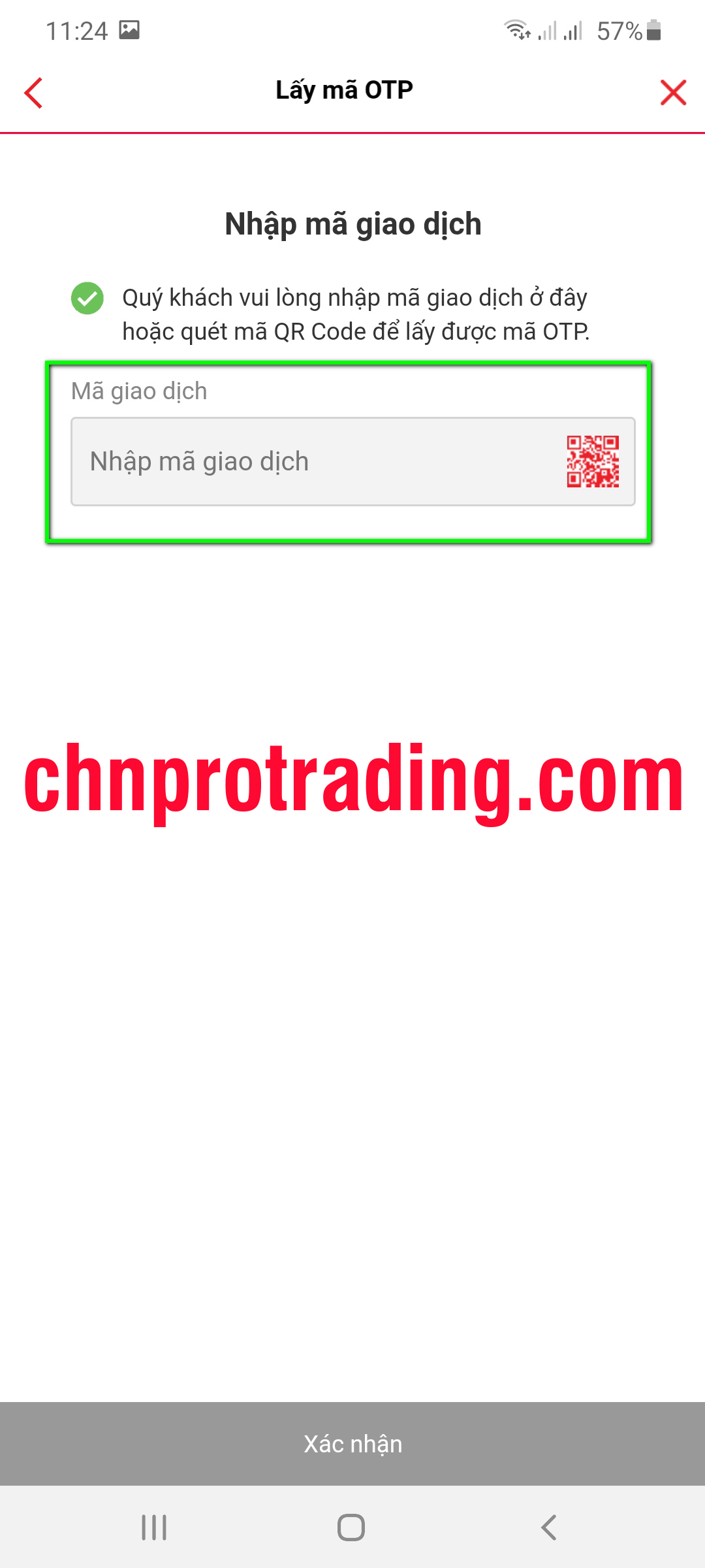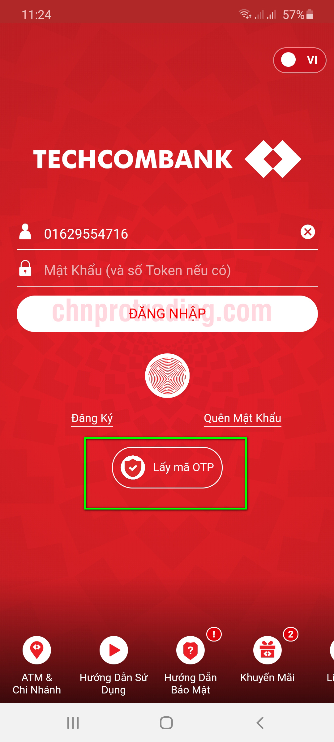 Nếu hiện ra 1 dòng mã dùng để nhập lấy code OTP trên Mobile banking của Tech thì bạn vào app trên điện thoại chọn nút như hình dưới