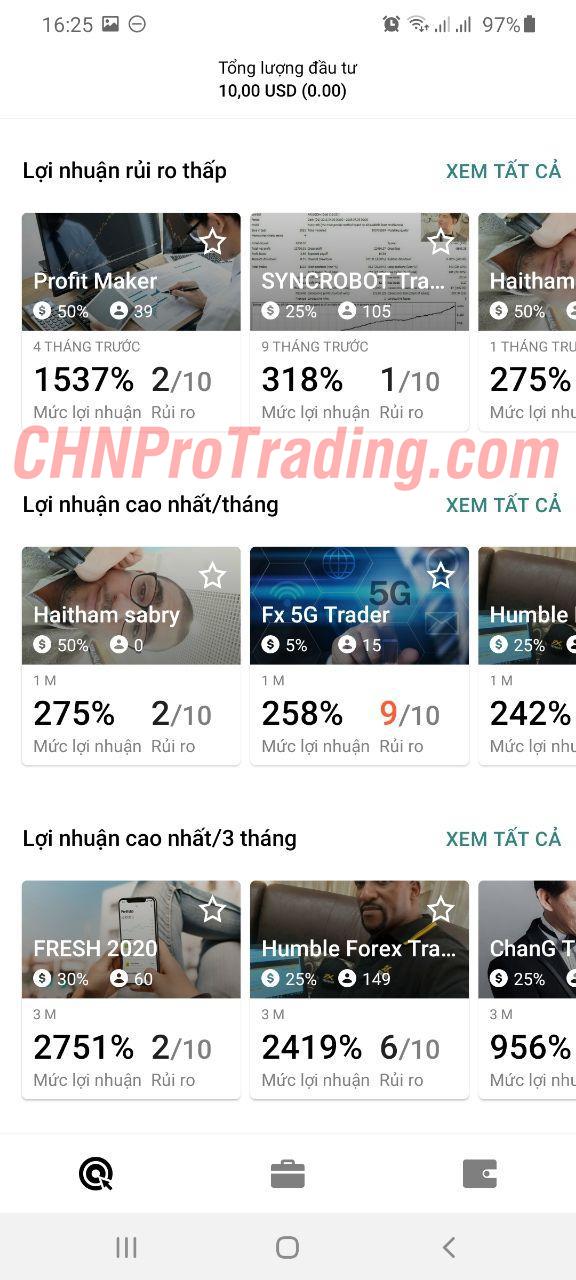 Lời Khuyên: Bạn nên chọn những người có điểm rủi ro từ 7 trở xuống, mức hoa hồng từ 20% trở xuống và lợi nhuận bạn thấy phù hợp với mong muốn của bản thân. Nên chọn người có mức tăng trưởng có thể ít nhưng đều mỗi tháng, tích tiểu thành đại mà.