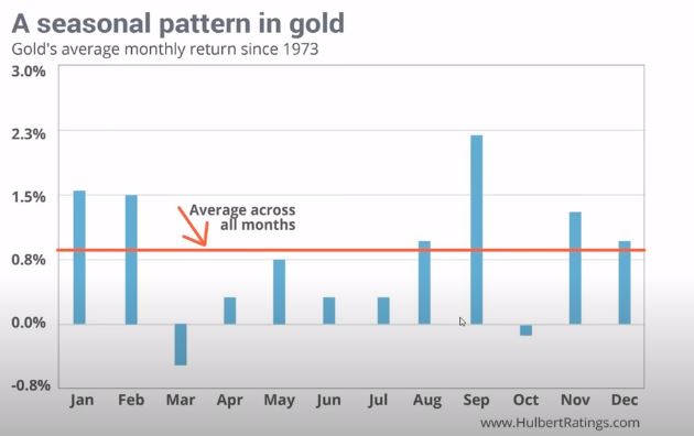 Bạn có thể thấy trên ảnh có từ tháng 1 đến tháng 12 và đường trung bình này là trung bình của giá đấy, bạn có thể thấy qua các thang. Chúng ta sẽ chú ý một chút đó là tháng 1, tháng 2, tháng 9, tháng 11 và tháng 12. Đây là 5 tháng mà giá vàng nhích hơn và có khả năng là tăng vào những tháng đó thì giá sẽ tăng (khả năng cao là giá sẽ tăng bởi vì theo thống kê nhưng không phải lúc nào cũng thế sẽ có lúc này lúc khác nhưng mà thường) Chính vì vậy từ biểu đồ này chúng ta có thể suy ra những cái gì.