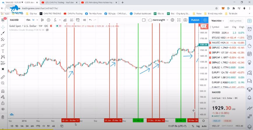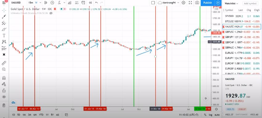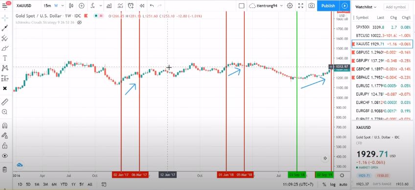 Vào những lúc như thế này thì rất có thể chúng ta sẽ hoặc là sẽ vào lệnh Buy hoặc nếu vào điểm tốt rồi thì chúng ta có thể giữ dài để ăn dài và chúng ta có thể giảm bớt lệnh Sell xuống, vậy thì làm sao để chúng ta biết là nó có hiệu quả không thì chúng ta hãy vào chart để xem thì chúng ta sẽ lập tức biết ngay là hiệu quả hay không. Và ở trên chart của mình, mình có đánh dấu từ năm 2017, còn xem lại từ trước nữa thì bạn có thể tự xem nhé, mình sẽ ấn Ichimoku đi để nhìn cho dễ